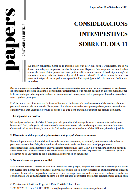 Davant els atemptats de l’11-S, reflexionant críticament, constatem que no existeix la seguretat total, que tots els morts són iguals, independentment de color, religió o nacionalitat, que no es tracta de la lluita del bé contra el mal, que no hi ha una superioritat moral d’uns, que per cert varen llençar la bomba atòmica i varen ensinistrar torturadors i dictadors llatinoamericans, sobre altres, per molt fonamentalistes que siguin, que si assassines, tortures, menysprees, la història et passarà factura. Segons Galeano: “...fonamentalistes religiosos i fonamentalistes de mercat... comparteixen el mateix menyspreu per la vida humana...”.