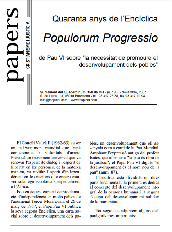 Populorum Progressio, encíclica de Pau VI, 1967, tracta el desenvolupament en l’àmbit de les descolonitzacions. El papa dedica una part al desenvolupament integral de la persona i una altra al desenvolupament solidari de la humanitat. I. Salvat mostra els paràgrafs més significatius de l’encíclica i remarca com Pau VI posa èmfasi en l’intercanvi desigual que condemna als pobres a seguir immersos en la seva pobresa. “El desenvolupament és el nou nom de la pau”. Missatge del papa a totes les persones de bona voluntat.
