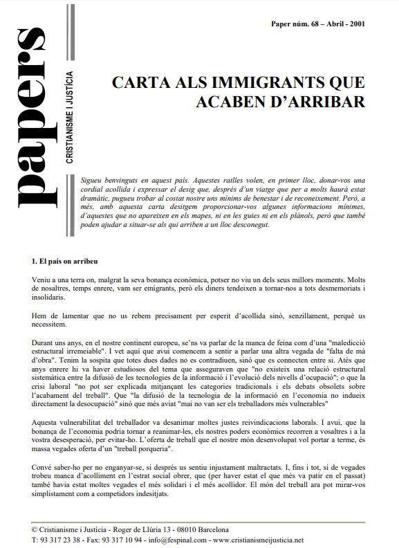 Mitjançant una carta adreçada als immigrants se’ls avisa que es poden trobar amb el rebuig dels treballadors autòctons, que els veuen com a competidors, i que, possiblement, vindran  amb la idea que a Europa es faran rics i es trobaran que això tan sols és un somni.  Si després d’informar-se decideixen venir cal que s’integrin i no formin guetos, això sí, sense perdre la seva identitat i la seva religió i acceptant els ideals que es deriven dels Drets Humans, drets que no sempre són respectats pels europeus.