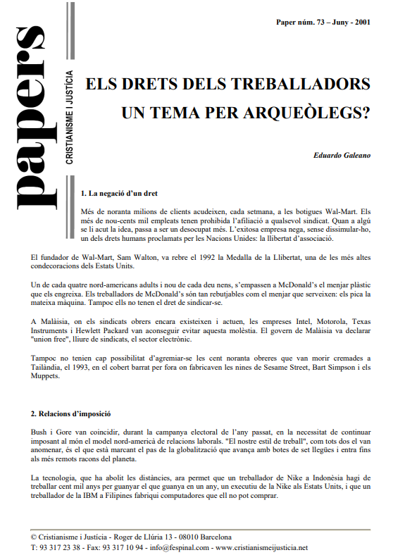 Què s’ha fet dels drets dels treballadors a les grans empreses de les economies més avançades? Wal-Mart i McDonald’s no contemplen que els seus treballadors puguin sindicar-se. Com elles, altres multinacionals molt “respectables”. No prou contents amb el que fan les seves empreses, els Estats Units intenten imposar el seu model laboral a la resta del món. Tant ells com la Xina, i d’altres països, intenten anorrear uns drets laborals que tant varen costar assolir. I els treballadors a la pitjor de les presons: la por. Por a la desocupació, fonamentalment.