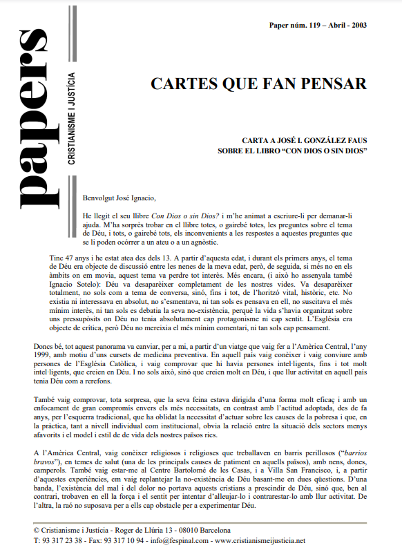 Mitjançant dues cartes, la de Mariela a J. I. González-Faus i la d’Ernesto Sábato a Jon Sobrino, es posa de relleu que en mig del sofriment i del dolor es pot trobar Déu. Mariela veu trontollar el seu ateisme per la convivència, a l’Amèrica Central, amb creients molt intel·ligents que actuen contra les injustícies. Sábato es va commoure en llegir el llibre de Sobrino sobre el terratrèmol. Sobrino contesta parlant de la santedat dels pobres i d’un Crist germà i defensor dels oprimits. És més fàcil trobar Jesús entre els febles que allà on regna l’opulència.