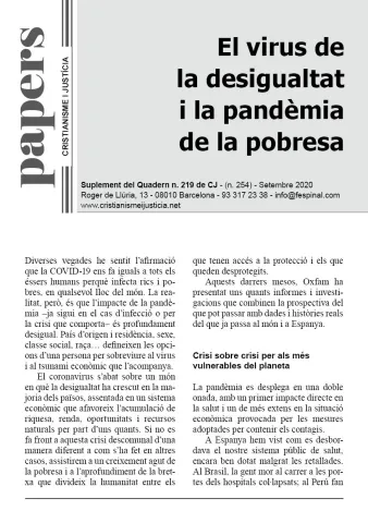 El coronavirus s’abat sobre un món en què la desigualtat ha crescut en la majoria dels països, assentada en un sistema econòmic que afavoreix l’acumulació de riquesa, renda, oportunitats i recursos naturals per part d’uns quants. Si no es fa front a aquesta crisi descomunal d’una manera diferent a com s’ha fet en altres casos, assistirem a un creixement agut de la pobresa i a l’aprofundiment de la bretxa que divideix la humanitat entre els que tenen accés a la protecció i els que queden desprotegits.