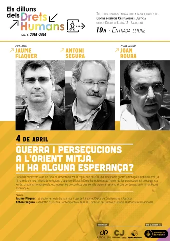 La fallida primavera àrab de Síria ha desestabilitzat la regió; des de 2011 una incessable guerra amenaça la població civil i ja hi ha més de nou milions de refugiats. L’aparició d’Estat Islàmic ha incrementat l’horror de les persecucions i execucions a kurds, cristians, homosexuals, etc. Aquest és un conflicte que sembla agreujar-se amb el pas del temps, però, hi ha alguna esperança? Ponents: Jaume Flaquer, sj, doctor en estudis islàmics i cap de l'àrea teològica de Cristianisme i JustíciaAntoni Segura, catedràtic d'Història Contemporània de la UB, director del Centre d'Estudis Històrics Internacionals Moderador: Joan Roura, periodista especialista en l'Orient Mitjà Entrada lliure. L'acte es retransmetrà en streaming i es podrà seguir a: www.cristianismeijusticia.net/en-directe