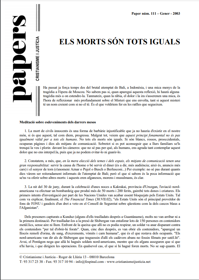 Sota el títol “Els morts són tots iguals”, una reflexió sobre el tracte diferent que es dona a Occident a les víctimes d’atemptats o fets de guerra segons siguin occidentals o no. Passen quasi desapercebudes quan el botxí és un país dels nostre entorn o de la nostra cultura. També es remarca que la por es troba en l’origen de molts dels fets execrables que es produeixen al món i que un mal no justifica un altre mal. Totes les persones tenen la mateixa dignitat humana.