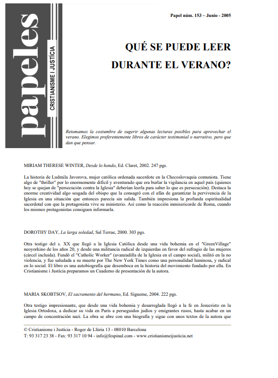 Recomendación de lecturas para el verano. WINTER: "Desde lo hondo", una mujer ordenada sacerdote en la Checoslovaquia comunista. DAY: "La larga soledad", una feminista en el Nueva York de los años 20. Skobtsov: "El sacramento del hermano", el altruismo de una mujer que ayuda a judíos y rusos en el París ocupado por los nazis. GEORGE: "Otro mundo es posible", por otra globalización. Sesboüé: "El magisterio a examen", contra el abuso de la jerarquía. AMADO: "Capitanes de la arena", sobre los niños de la calle. Y Lamet: "Juan Pablo II. Hombre y papa ", y GONZÁLEZ FAUS:" Comprender a K. Wojtila".