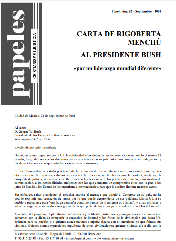 Ante los atentados del 11-S, reflexionando críticamente, constatamos que no existe la seguridad total, que todos los muertos son iguales, independientemente de color, religión o nacionalidad, que no se trata de la lucha del bien contra el mal, que no hay una superioridad moral de unos, que por cierto lanzaron la bomba atómica y adiestraron torturadores y dictadores latinoamericanos, sobre otros, por muy fundamentalistas que sean, que si asesinas, torturas, desprecias, la historia te pasará factura. Según Galeano: "... fundamentalistas religiosos y fundamentalistas de mercado... comparten el mismo desprecio por la vida humana...".