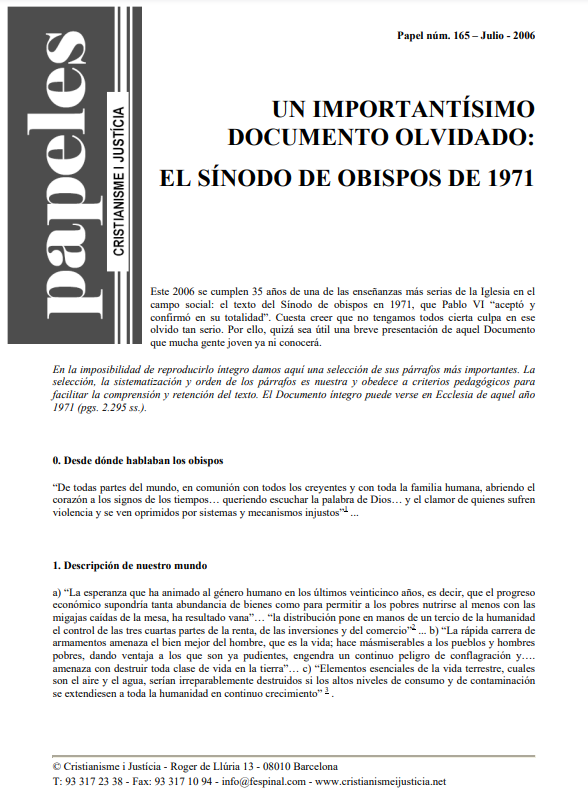 En 1971 se celebró el Sínodo de obispos, bajo el pontificado de Pablo VI. Se partía del clamor de los pobres y los que sufren violencia. Una de las primeras veces que se habla de desigualdad y contaminación y consumo. Una Iglesia que tiene que vivir amor y justicia al unísono. En 1968, Pablo VI había considerado en PP que "el desarrollo era el nuevo nombre de la paz". Idea y deseo que se vio reflejado en el Sínodo, el último en que los obispos pudieron redactar un documento.