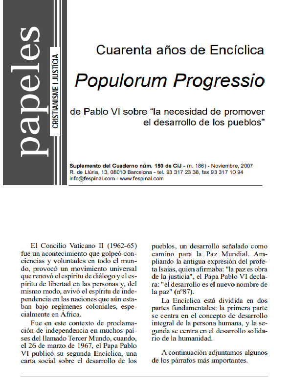 Populorum Progressio, encíclica de Pablo VI, 1967, trata el desarrollo en el ámbito de las descolonizaciones. El papa dedica una parte al desarrollo integral de la persona y otra al desarrollo solidario de la humanidad. I. Salvat muestra los párrafos más significativos de la encíclica y remarca como Pablo VI pone énfasis en el intercambio desigual que condena a los pobres a seguir inmersos en su pobreza. "El desarrollo es el nuevo nombre de la paz". Mensaje del papa a todas las personas de buena voluntad.