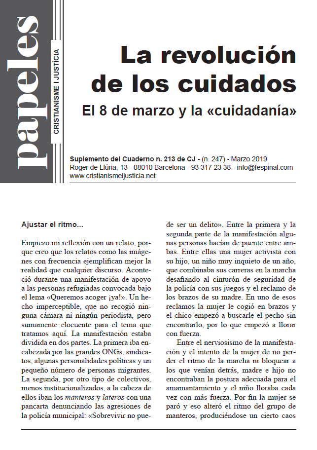 El ecofeminismo y la economía feminista han sacado los cuidados del espacio de lo íntimo para ubicarlos en la plaza pública, urgiéndonos a revolucionarlos y a pasar de la ciudadanía a la “cuidadanía”; es decir, un sistema de relaciones y reorganización social que pone en el centro la sostenibilidad de la vida y el cuidado como una categoría relacional y política sin la cual la vida no es posible. En este Papel se habla de ello y de cómo una espiritualidad del cuidado y la atención puede ayudar a una causa en la que se juega el futuro de la humanidad y de todo el planeta.