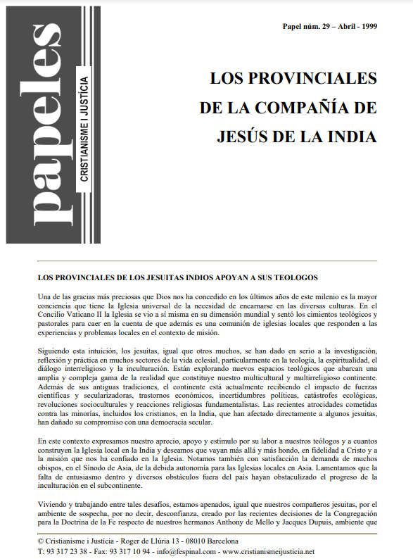 El escrito inédito que presentamos reproduce la intervención que tuvo el autor en un congreso de teólogos asiáticos -cristianos y de otras religiones- que tuvo lugar en Nueva Delhi el diciembre del año 1987. A este congreso asistieron tres invitados de Latinoamérica a quienes se les pidió que presentaran sus reacciones a lo dicho por los asiáticos. Reproducimos las propias palabras del autor. “Voy a apuntar algo de lo que me piden: Desde el punto de vista estrictamente religioso creo que el cristianismo tiene que estar abierto al talante asiático, aunque no fuese más que para moderar su intolerancia desde el talante asiático de tolerancia, y, a la inversa, el mundo asiático puede enriquecerse con el talante ético-práxico del cristianismo para que su tolerancia no se traduzca en indiferencia”. “De todas formas, lo más importante de este encuentro es para mí el tomar conciencia, una vez más, de que la situación del Tercer mundo exige una urgente solución, que eso es lo que debe mover a la mejor comprensión mutua y unificación de las diversas tradiciones religiosas, y a que cada una de ellas aporte lo mejor que tiene para la liberación”.