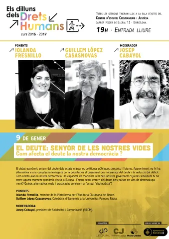 El debat econòmic entorn del deute dels estats marca les polítiques públiques presents i futures. Aparentment no hi ha alternativa a uns comptes intervinguts on la prioritat és el pagament dels interessos del deute i la reducció del dèficit. Com afecta això la nostra democràcia i la capacitat de maniobra real dels nostres governants? Quines similituds hi ha entre aquest moment econòmic viscut a Europa i l’etern debat entorn del deute dels països en vies de desenvolupament? Quines alternatives reals i practicades coneixem a l’actual “deutecràcia”?