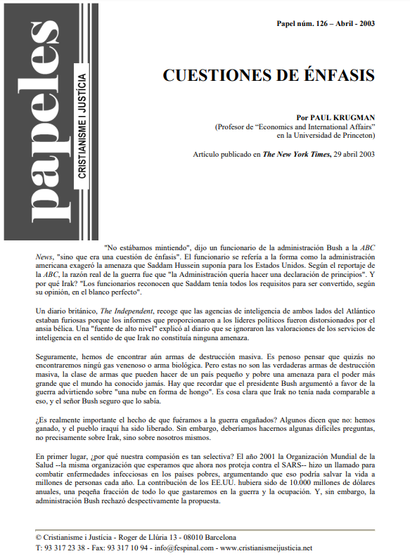 Krugman,en un artículo publicado en The New York Times, hace una dura crítica de la intervención occidental en Irak, donde se sabía que no había armas de destrucción masiva, y se pregunta por qué occidente, encabezado por los Estados Unidos, es tan selectivo a la hora de escoger objetivos para intervenir. ¿Por qué Irak y no Costa de Marfil o por qué no destinar recursos, probablemente no tan cuantiosos, a frenar las epidemias en el mundo? El autor también critica la cobertura hecha por los medios de comunicación estadounidenses por su falta de objetividad.
