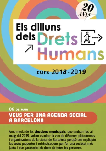 Con motivo de las elecciones municipales del próximo 26 de mayo de 2019, el Ciclo de los Lunes de los Derechos Humanos 2018/2019 quiere escuchar la voz de diferentes plataformas y organizaciones de la ciudad de Barcelona para que puedan hacer llegar sus propuestas y reivindicaciones a representantes de diferentes partidos políticos, para hacer una sociedad más justa y que garantice los derechos de todas las personas.