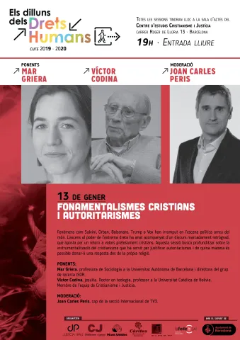 Fenómenos como Salvini, Orban, Bolsonaro, Trump o Vox han irrumpido en la escena política en todo el mundo. del mundo. El ascenso al poder de la extrema derecha ha ido acompañado de un discurso marcadamente retrógrado, que apuesta por un retorno a valores pretendidamente cristianos. Esta sesión busca profundizar sobre la instrumentalitzación del cristianismo que ha servido para justificar autoritarismos y de qué manera es posible darle una respuessta desde la propia religión.