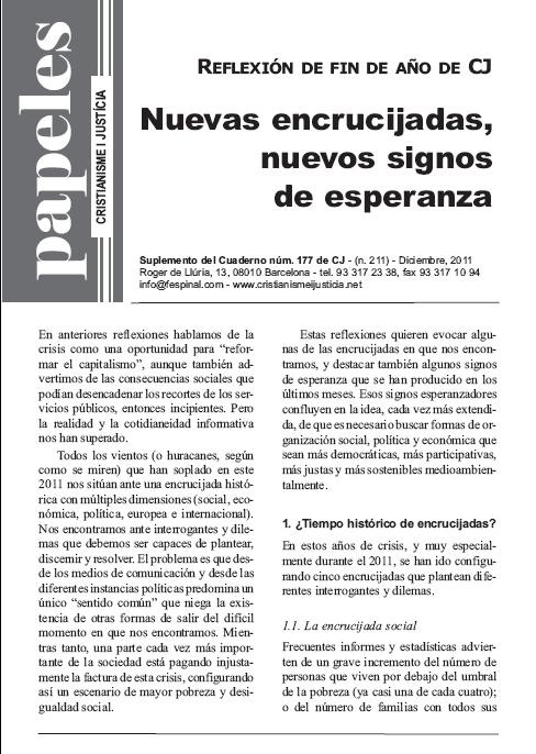 Este es el título de la reflexión de fin de año que hemos elaborado desde Cristianisme i Justícia. En el texto señalamos tanto los puntos que consideramos más preocupantes de la actual situación económica y social como algunos signos de esperanza que deberían ayudarnos a superar este difícil momento. Ante el riesgo de ir hacia un “escenario de mayor pobreza y desigualdad” se hace necesaria la búsqueda de formas de organización social más justas.