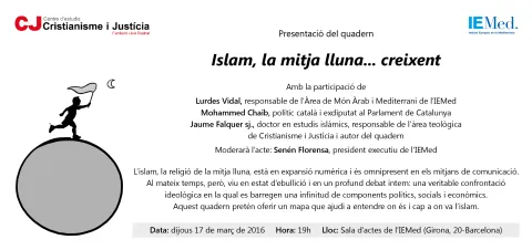 Amb la participació de:Lurdes Vidal, responsable de l’Àrea de Món Àrab i Mediterrani de l’IEMedMohammed Chaib, polític català i exdiputat al Parlament de CatalunyaJaume Falquer sj., doctor en estudis islàmics, responsable de l’àrea teològica de Cristianisme i Justícia i autor del quadernModerarà l’acte: Senén Florensa, president executiu de l’IEMedL’islam, la religió de la mitja lluna, està en expansió numèrica i és omnipresent en els mitjans de comunicació. Al mateix temps, però, viu en estat d’ebullició i en un profund debat intern: una veritable confrontació ideològica en la qual es barregen una infinitud de components polítics, socials i econòmics.Aquest quadern pretén oferir un mapa que ajudi a entendre on és i cap a on va l’islam.
