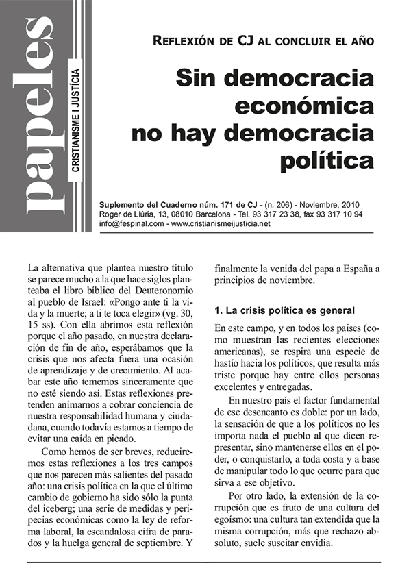 Este Papel recoge lo más destacable de 2010. Vivimos una crisis que golpea a los más pobres y pone en peligro el estado de bienestar. Ante ello, la población siente un doble desencanto: a los políticos solo les interesa mantenerse en el poder y la corrupción es omnipresente. Mientras, asistimos a un incremento de la desigualdad. Ante el imperio de los mercados el estado debe intervenir.