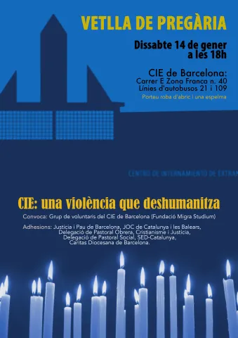 El sábado 14 de enero a las 18h se celebrará la vigilia de oración precisamente con el título CIE: Una violencia que deshumaniza. Organizado por el grupo de voluntarios de Migra Studium que visita el CIE y con la adhesión de otras organizaciones como Justícia i Pau, Càritas Barcelona, las Delegaciones diocesanas de Pastoral Obrera y Social, Cristianisme i Justícia, JOC Nacional i SED Catalunya.