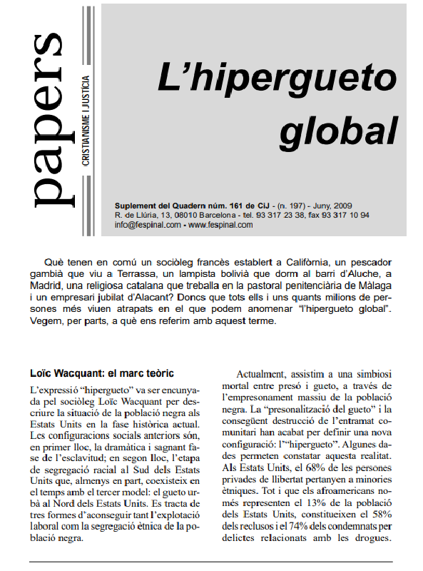“Hipergueto”, expressió que neix als Estats Units per a designar l’explotada i segregada població negra. De l’hipergueto nord-americà a l’hipergueto global? El jesuïta Izuzquiza critica durament l’externalització de les fronteres, els CIE com a presó i mantenir preventivament empresonats molts immigrants, oblidant els drets humans més bàsics. Immigrants sotmesos a criminalització ambiental, estigmatització  ètnica i vulnerabilitat social. Es tracta d’abocar els immigrants a la criminalitat?