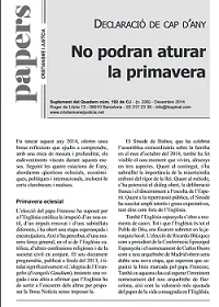 El centre d’estudis Cristianisme i Justícia, juntament amb el centre entreParéntesis, tanquen l’any amb la publicació d’una reflexió que recull les inquietuds i les fites més rellevants del 2014 i amb la celebració d’una vetlla de pregària per cap d’any el dia 31 de desembre a les 23:00h a l’església dels Jesuïtes del carrer Casp de Barcelona.La declaració de Cap d'Any porta per títol "no podran aturar la primavera" i, seguint les quatre estacions de l’any, aborda qüestions eclesials, econòmiques, polítiques i internacionals. Com a senyals d’alerta, el text recorda que la crisi ha colpejat les rendes més baixes i adverteix de l’amenaça que suposa la desigualtat per a la cohesió social. Davant de tot això, els autors del document citant al papa Francesc, apel·len a la dignitat de la persona humana i al bé comú, per damunt dels qui no volen renunciar als seus privilegis.Podeu fer difusió a les xarxes socials del text, així com donar la vostra opinió a partir del hashtag #2014aExamen