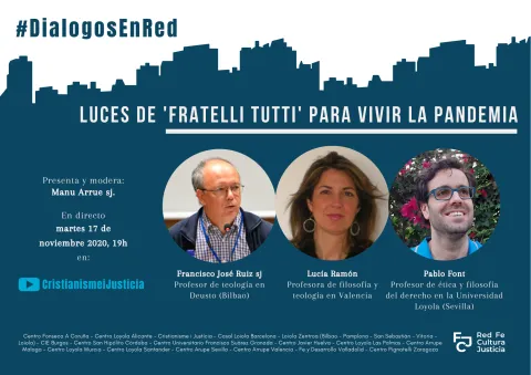 El proper 17 de novembre arriba una nova sessió dels #DiálogosEnRed. Serà amb la participació del jesuïta i degà de la Facultat de Teologia de Deusto, Francisco José Ruiz, la professora de filosofia i teologia a València Lucía Ramón, i el professor d'ètica i filosofia de el dret a la Loyola Andalusia, Pablo Font. Conversaran sobre les llums que ens dona l'encíclica Fratelli tutti per viure la pandèmia, moderats pel jesuïta Manu Arrue.