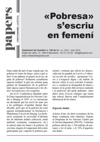 La feminització de la pobresa ha estat amagada durant molt de temps ja que, quan s’analitzaven les situacions de pobresa o exclusió social, no s’incloïa la variable de gènere. La dificultat d’accés a l’educació, a la terra i al crèdit, o la més gran precarietat i vulnerabilitat en el mercat laboral, són factors que contribueixen a l’empobriment de les dones i a afirmar que «la pobresa té rostre de dona». Cal donar visibilitat a aquest fenomen i entendre com el gènere influeix en el risc de patir pobresa.Descarrega't aquest Paper aquí. Pots veure tots els Papers publicats fins ara aquí.Si us interessen les nostres publicacions i voleu ajudar-nos amb una contribució, feu click aquí.