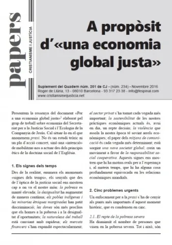 Un sistema econòmic que posi en el centre el subjecte econòmic i no la persona humana és injust des de la seva mateixa arrel. Per això ens hem de comprometre a seguir treballant per analitzar les causes estructurals de la injustícia en el nostre món. Amb la «intenció» de mobilitzar-nos a actuar des dels principis ètics de la doctrina social de l’Església, el Secretariat per a la Justícia Social i l’Ecologia de la Companyia de Jesús, ha elaborat des de l’òptica de la praxi el document «Per a una economia global justa», a partir del qual neix aquesta anàlisi feta pel grup d’economismes de Cristianisme i Justícia.
