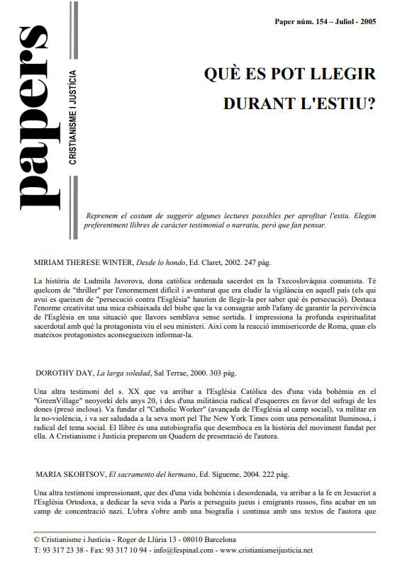 Subscripció al butlletíRecomanació de lectures per a l’estiu. WINTER: “Desde lo hondo”, una dona ordenada sacerdot a la Txecoslovàquia comunista. DAY: “La larga soledad”, una feminista al Nova York dels anys 20. SKOBTSOV: “El sacramento del hermano”, l’altruisme d’una dona que ajuda jueus i russos al París ocupat pels nazis. GEORGE: “Otro mundo es possible”, per una altra globalització. SESBOUÉ: “El magisterio a examen”, contra l’abús de la jerarquia. AMADO: “Capitanes de la arena”, sobre els nens del carrer. I LAMET: “Juan Pablo II. Hombre y papa”, i GONZÁLEZ FAUS: “Comprender a K. Wojtila”.